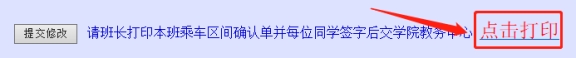 5.各班班长在确认本班同学全部完成填报后,通过系统在线打印功能打印班级乘车区间确认表(如图-3),由学生本人确认签字后统一交至所在学院教务办公室。
